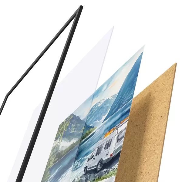 Das Poster besteht aus einem Rahmen, Plexiglas, einem gedruckten Bild und einer Rückwand aus Spanplatten. Dank der Halterungen auf der Rückseite kann das Poster sofort an die Wand gehängt werden.