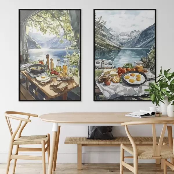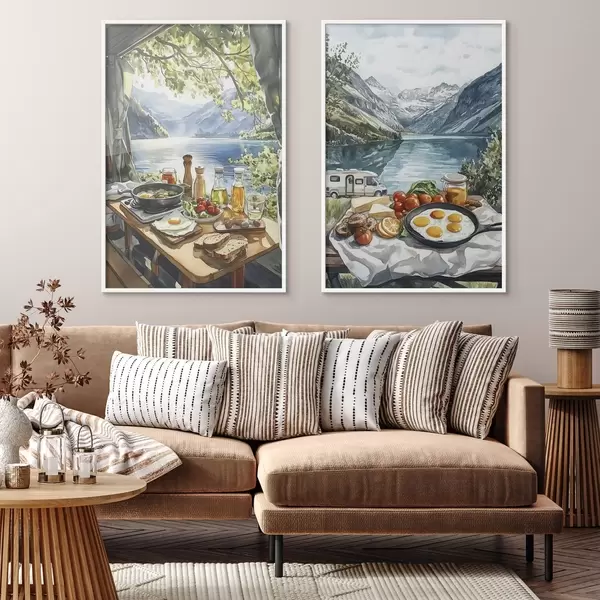 Poster Camping, ästhetisches Frühstück am See, Aquarellstil d00405