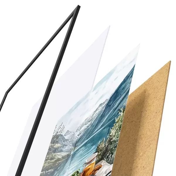Das Poster besteht aus einem Rahmen, Plexiglas, einem gedruckten Bild und einer Rückwand aus Spanplatten. Dank der Halterungen auf der Rückseite kann das Poster sofort an die Wand gehängt werden.