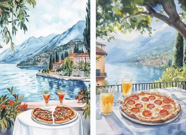 Poster Comer See, Brunch in Italien, Aquarellstil, Pizza Margarita, Sommer Natur d00406