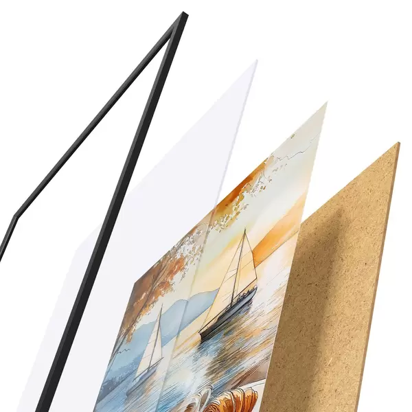 Das Poster besteht aus einem Rahmen, Plexiglas, einem gedruckten Bild und einer Rückwand aus Spanplatten. Dank der Halterungen auf der Rückseite kann das Poster sofort an die Wand gehängt werden.