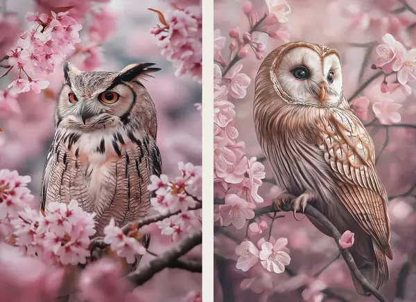 Poster Eulen auf dem Kirschbaum, rosa Blumen, Realismus, Natur Nr d00411