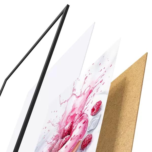 Das Poster besteht aus einem Rahmen, Plexiglas, einem gedruckten Bild und einer Rückwand aus Spanplatten. Dank der Halterungen auf der Rückseite kann das Poster sofort an die Wand gehängt werden.