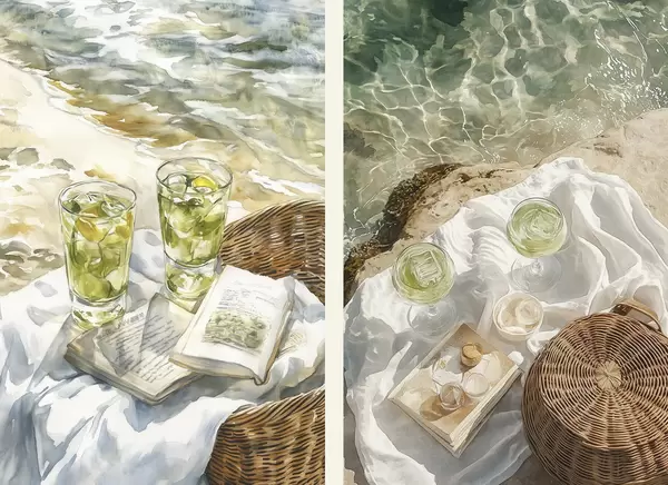 Poster Cocktails am Strand, Aquarell-Stil Zeichnung, Meer, Sommer-Picknick Nr d00417