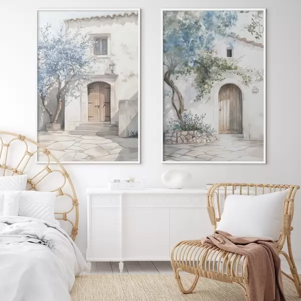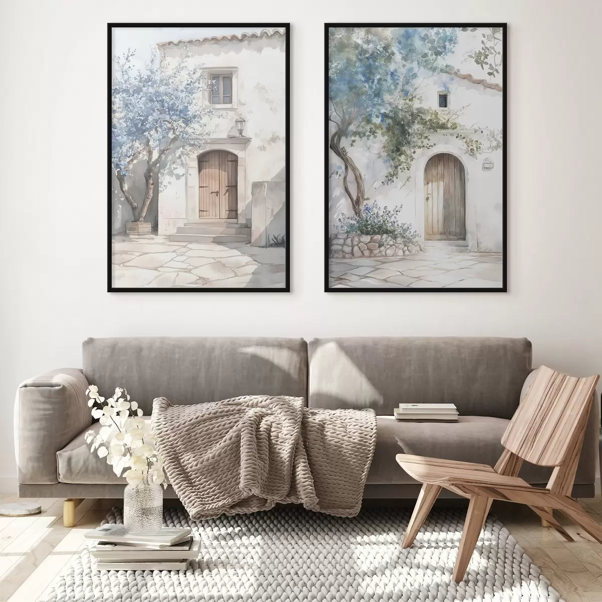 Poster Griechische weiße Häuser mit blühenden Bäumen, mediterran, Aquarell-Stil Zeichnung d00419
