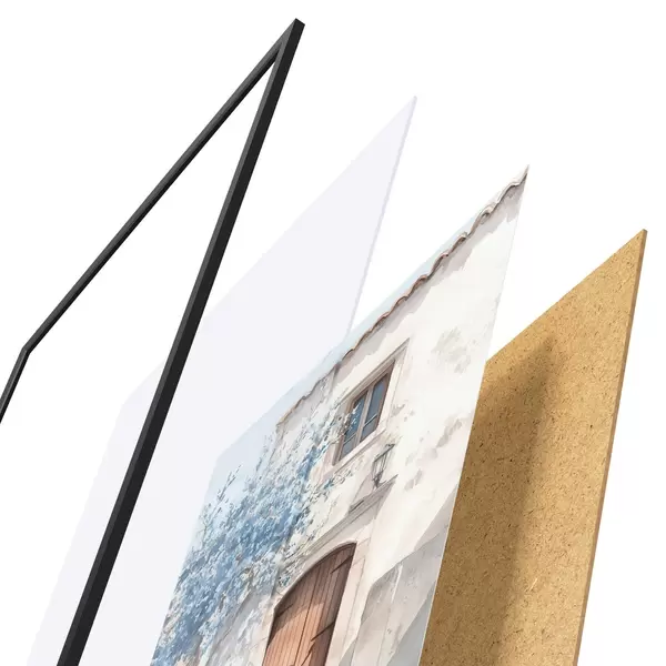 Das Poster besteht aus einem Rahmen, Plexiglas, einem gedruckten Bild und einer Rückwand aus Spanplatten. Dank der Halterungen auf der Rückseite kann das Poster sofort an die Wand gehängt werden.