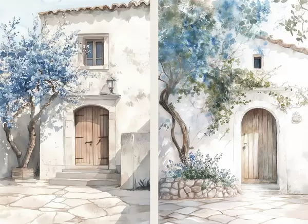 Poster Griechische weiße Häuser mit blühenden Bäumen, mediterran, Aquarell-Stil Zeichnung d00419