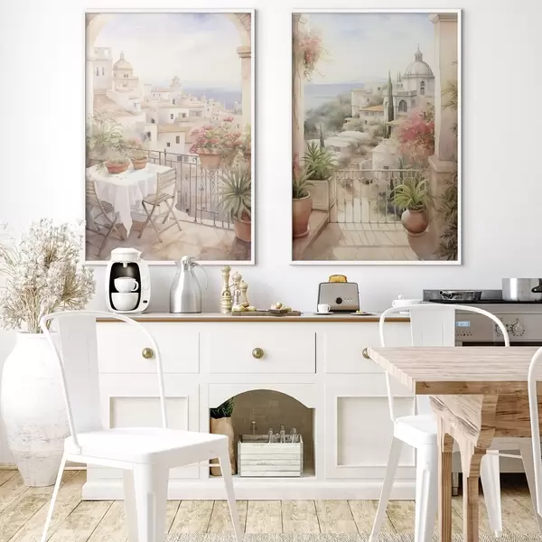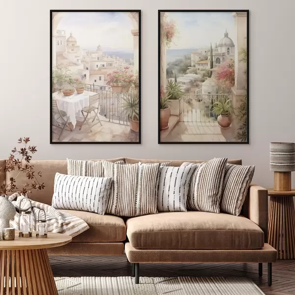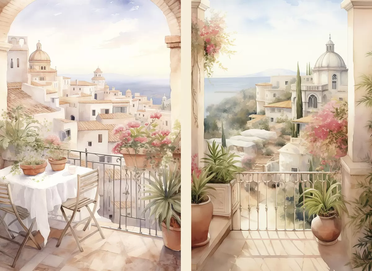 Poster Sonnenuntergang auf dem Balkon, Architektur, blühende Blumen, Aquarellstil, mediterran Nr d00420