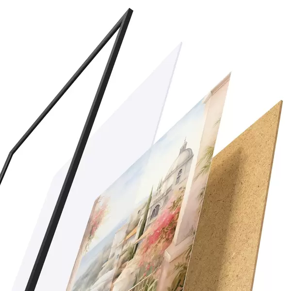 Das Poster besteht aus einem Rahmen, Plexiglas, einem gedruckten Bild und einer Rückwand aus Spanplatten. Dank der Halterungen auf der Rückseite kann das Poster sofort an die Wand gehängt werden.