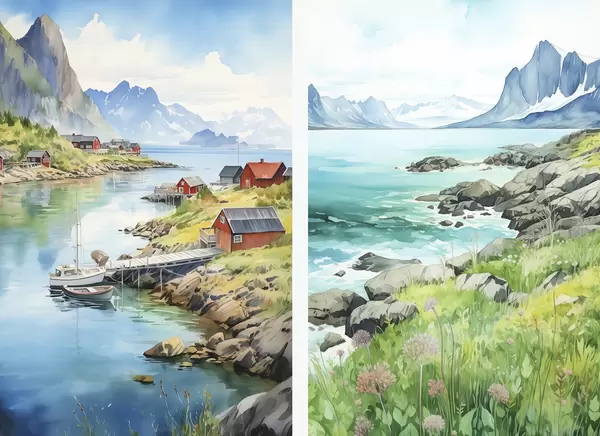 Poster Norwegen Natur, Lofoten Inseln, Sommerlandschaft, rote Häuser, Berge, Boote Nr d00421