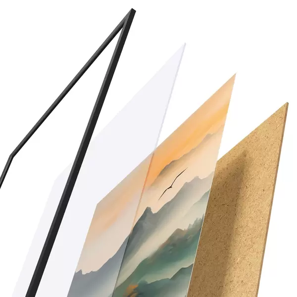 Das Poster besteht aus einem Rahmen, Plexiglas, einem gedruckten Bild und einer Rückwand aus Spanplatten. Dank der Halterungen auf der Rückseite kann das Poster sofort an die Wand gehängt werden.
