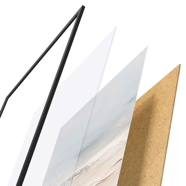 Das Poster besteht aus einem Rahmen, Plexiglas, einem gedruckten Bild und einer Rückwand aus Spanplatten. Dank der Halterungen auf der Rückseite kann das Poster sofort an die Wand gehängt werden.
