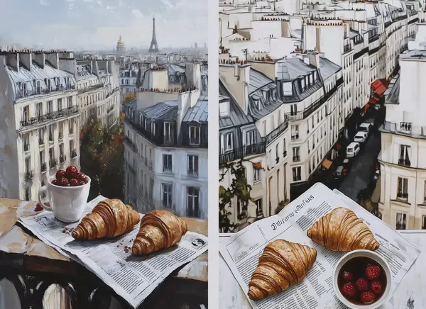Poster Stadtansicht auf einem Balkon in Paris, Eiffelturm, Erdbeeren, Kaffee, Tagebuch d00445
