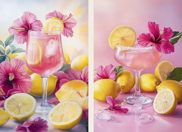 Poster Cocktails mit Hibiskusblüten und Zitronen, Sommer, saftig, Aquarellstil d00446