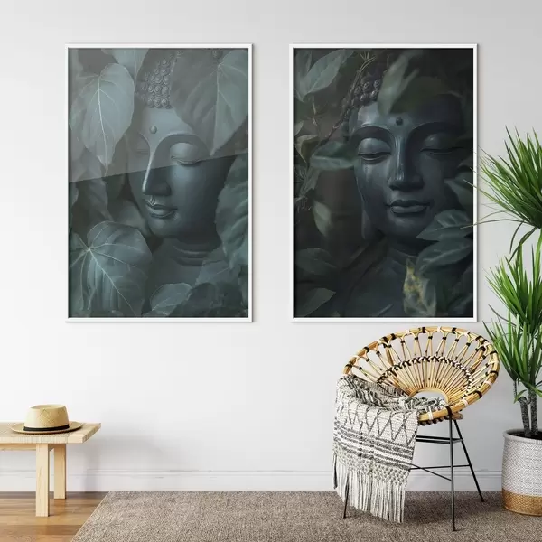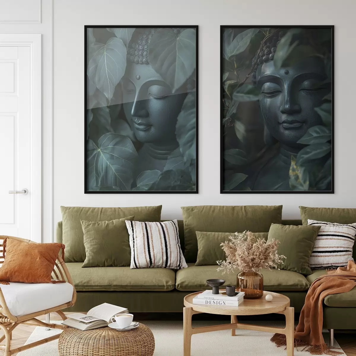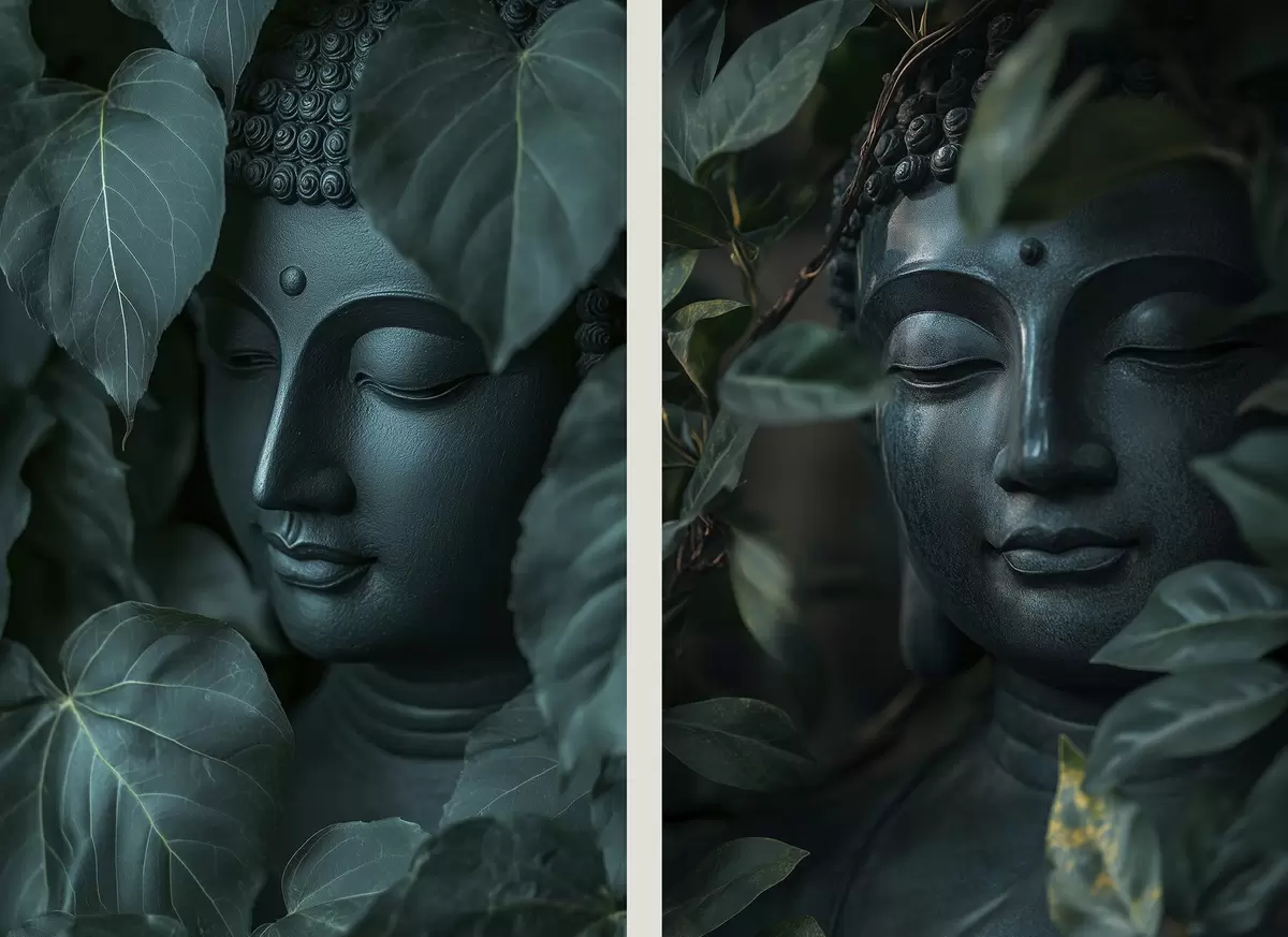 Poster Meditativer Buddha in den grünen Blättern, Buddhismus, tropisch, Realismus d00447