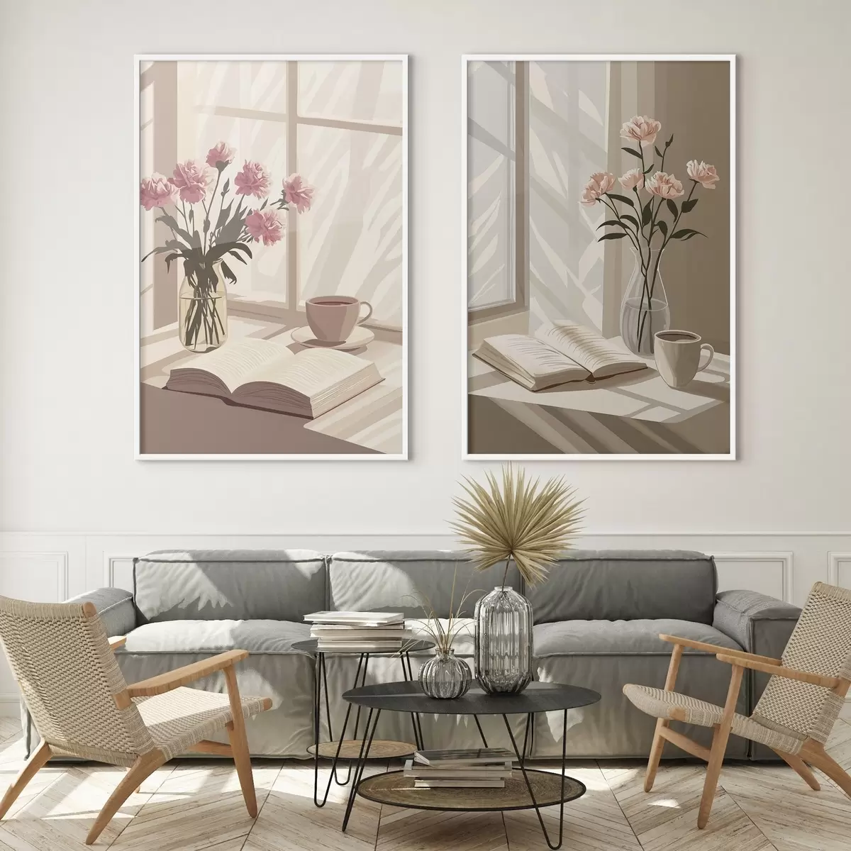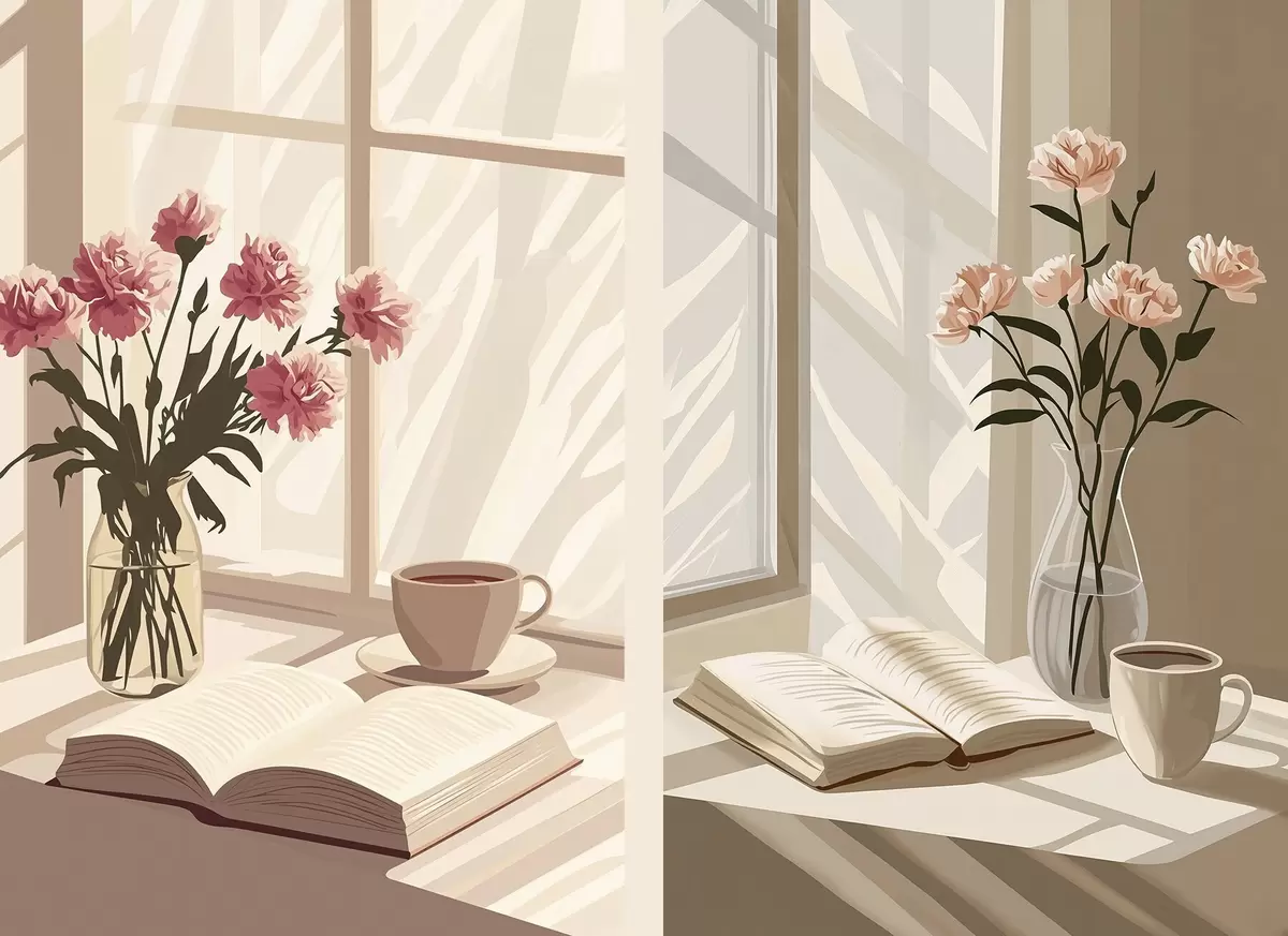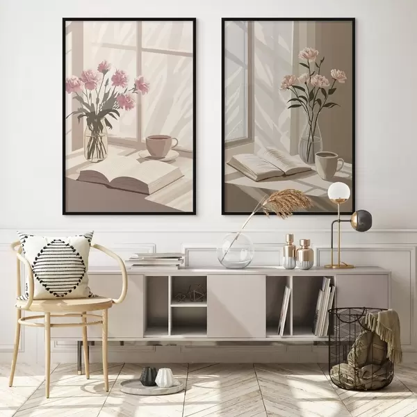 Poster Abstraktion, Morgenästhetik, Tasse Kaffee, Buch, Blumen d00448