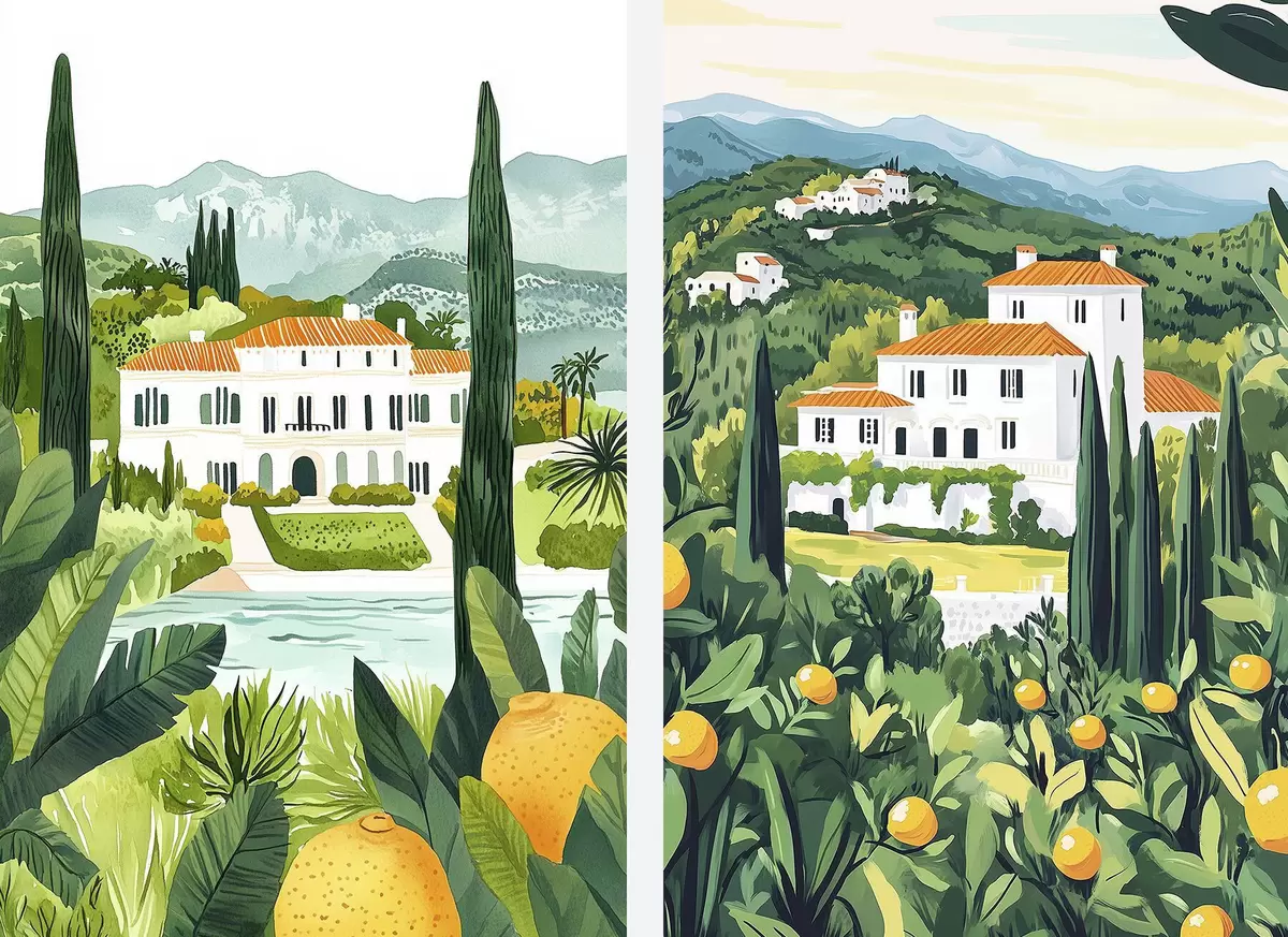 Poster Mediterrane Landschaften mit Bäumen und Häusern, Meeresküste, Spanien Nr d00450