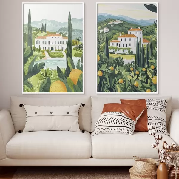 Poster Mediterrane Landschaften mit Bäumen und Häusern, Meeresküste, Spanien d00450