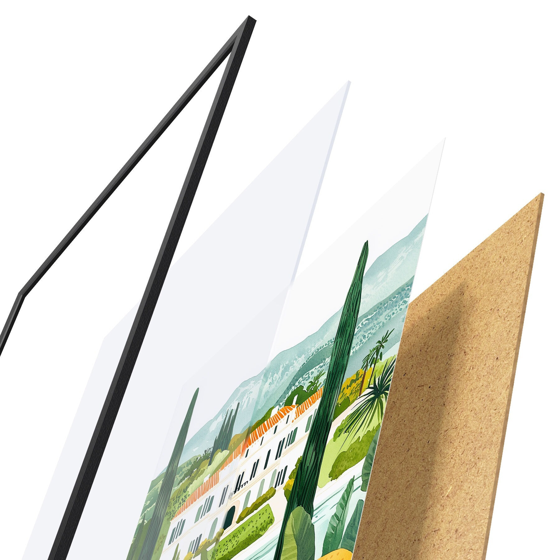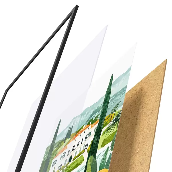 Das Poster besteht aus einem Rahmen, Plexiglas, einem gedruckten Bild und einer Rückwand aus Spanplatten. Dank der Halterungen auf der Rückseite kann das Poster sofort an die Wand gehängt werden.