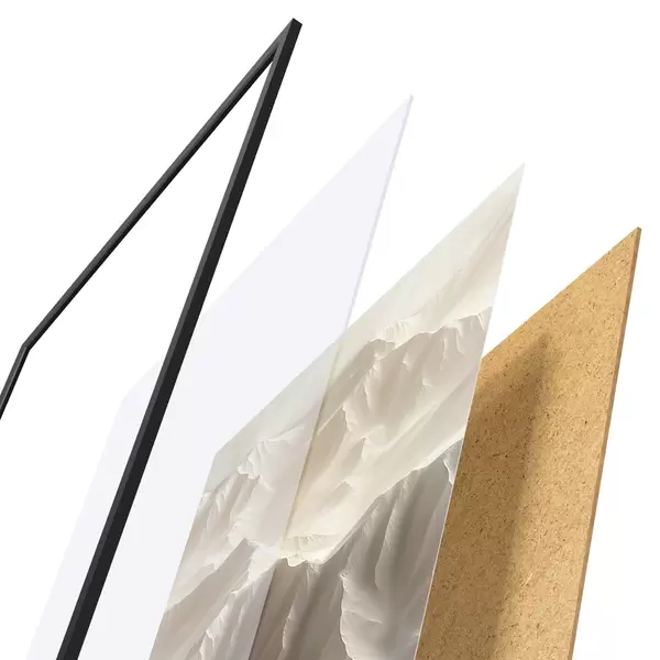 Das Poster besteht aus einem Rahmen, Plexiglas, einem gedruckten Bild und einer Rückwand aus Spanplatten. Dank der Halterungen auf der Rückseite kann das Poster sofort an die Wand gehängt werden.