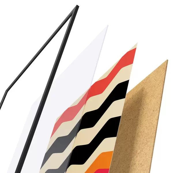 Das Poster besteht aus einem Rahmen, Plexiglas, einem gedruckten Bild und einer Rückwand aus Spanplatten. Dank der Halterungen auf der Rückseite kann das Poster sofort an die Wand gehängt werden.