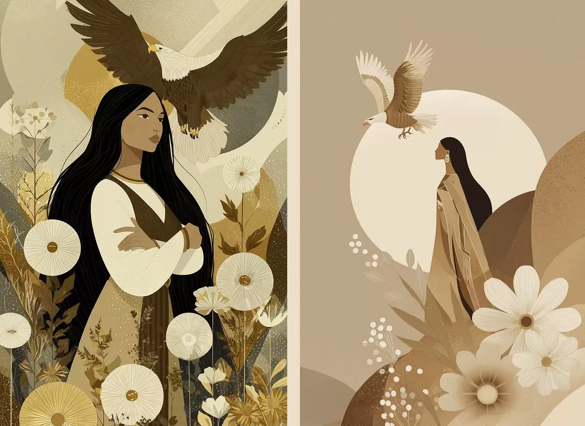 Poster Frauen mit fliegenden Adlern, Tribal-Stil, beige Farben Nr d00477
