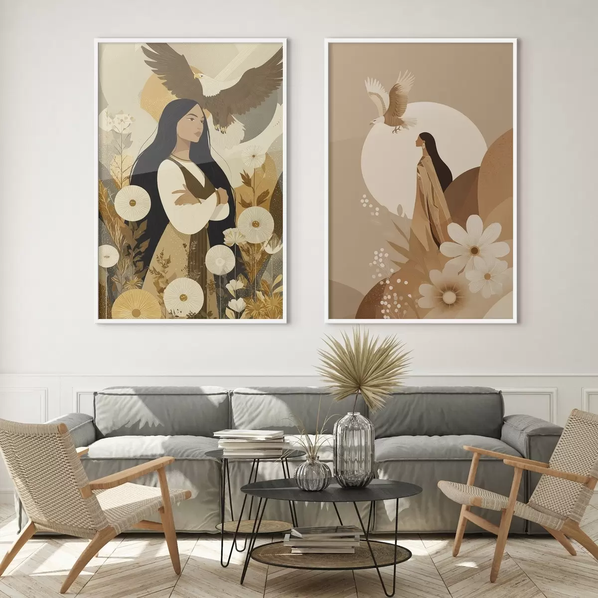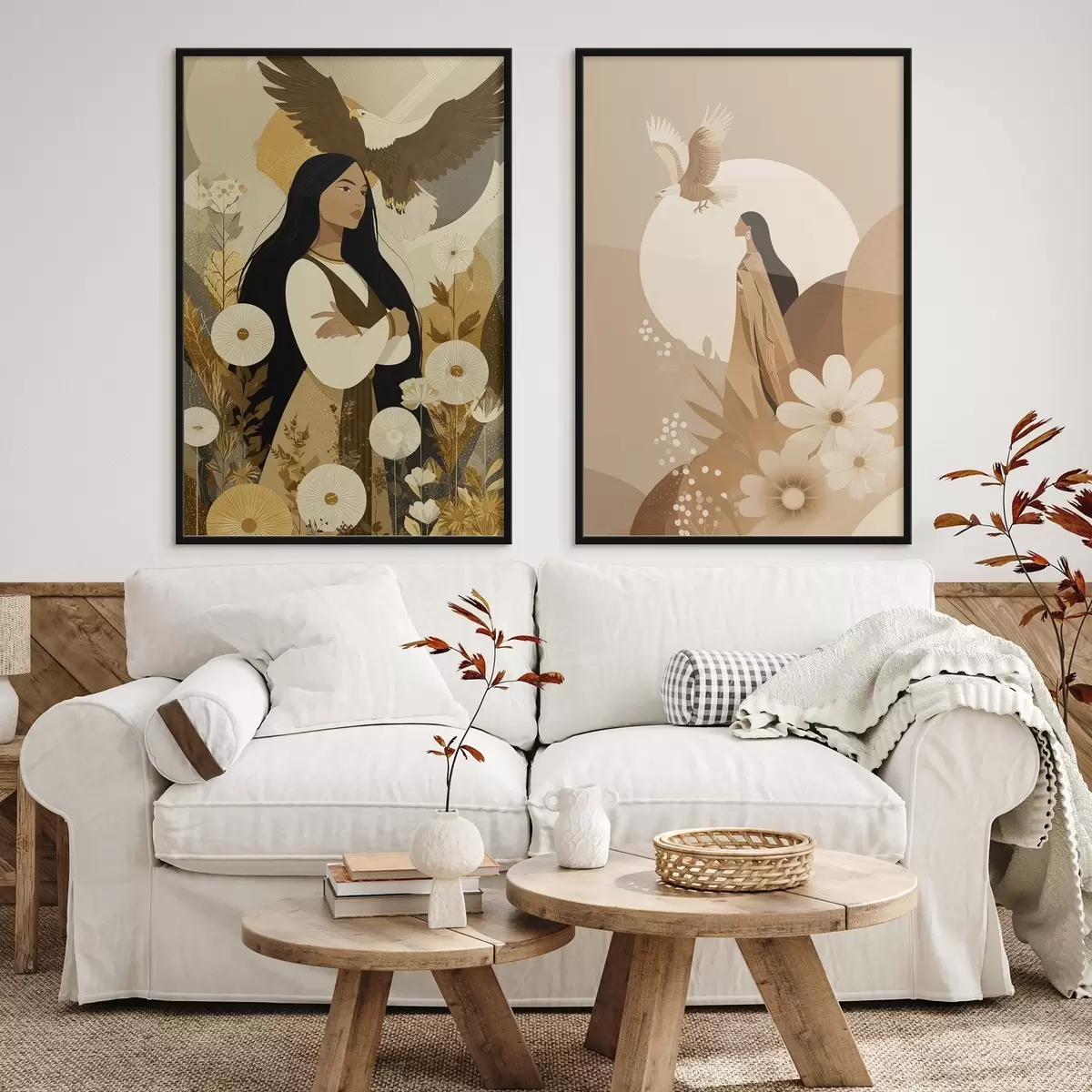 Poster Frauen mit fliegenden Adlern, Tribal-Stil, beige Farben d00477