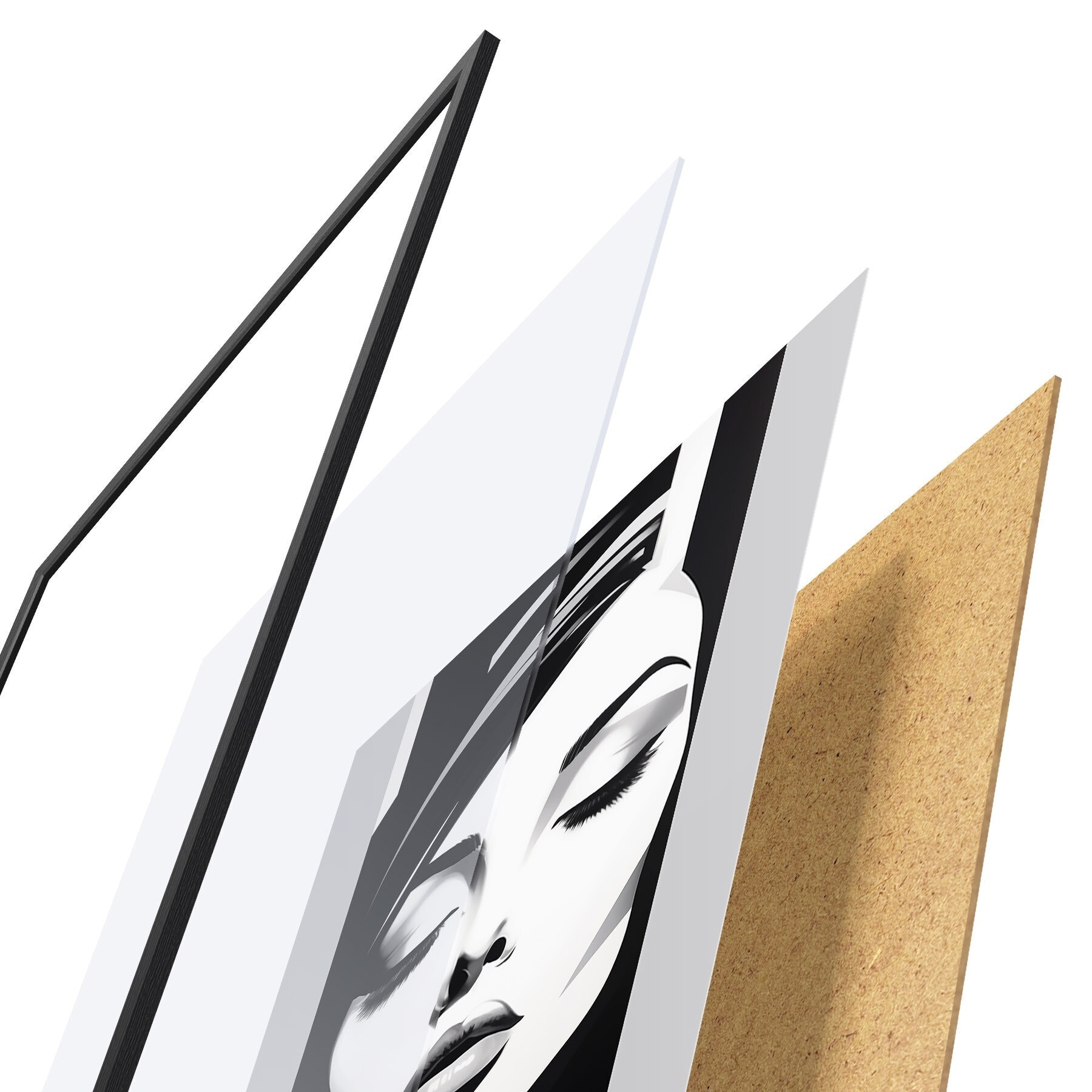 Das Poster besteht aus einem Rahmen, Plexiglas, einem gedruckten Bild und einer Rückwand aus Spanplatten. Dank der Halterungen auf der Rückseite kann das Poster sofort an die Wand gehängt werden.