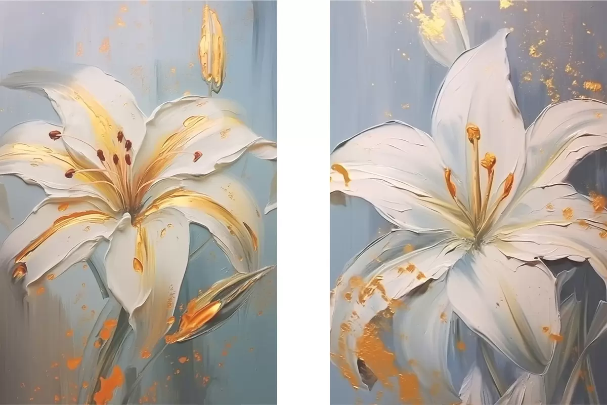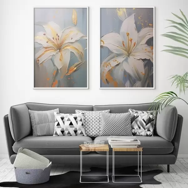 Poster Weiße Lilien mit gelben Strichen auf blauem Hintergrund Nr d00497
