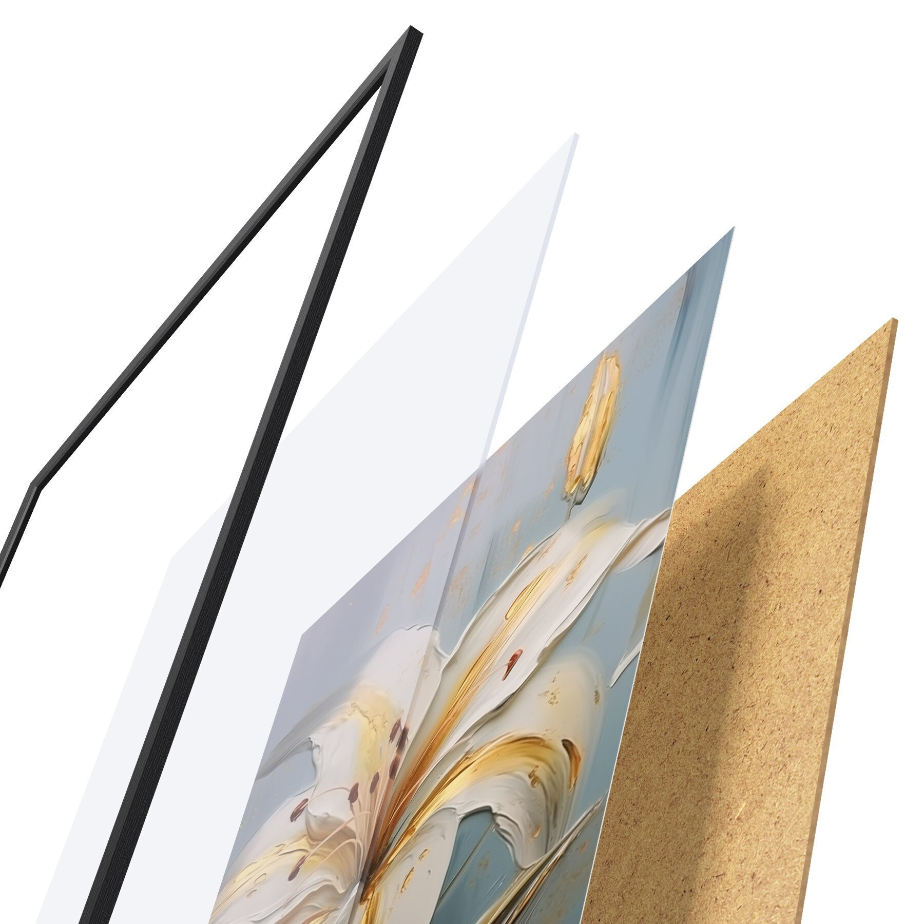 Das Poster besteht aus einem Rahmen, Plexiglas, einem gedruckten Bild und einer Rückwand aus Spanplatten. Dank der Halterungen auf der Rückseite kann das Poster sofort an die Wand gehängt werden.
