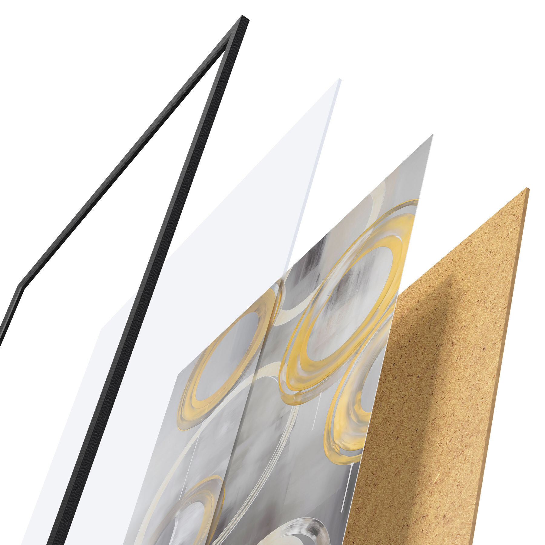 Das Poster besteht aus einem Rahmen, Plexiglas, einem gedruckten Bild und einer Rückwand aus Spanplatten. Dank der Halterungen auf der Rückseite kann das Poster sofort an die Wand gehängt werden.