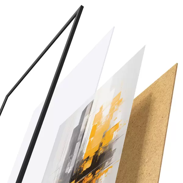 Das Poster besteht aus einem Rahmen, Plexiglas, einem gedruckten Bild und einer Rückwand aus Spanplatten. Dank der Halterungen auf der Rückseite kann das Poster sofort an die Wand gehängt werden.