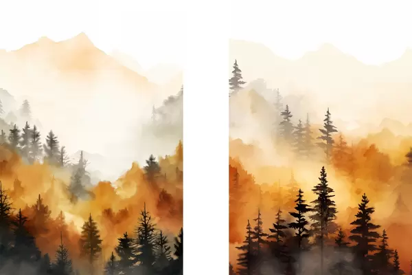 Poster Eine Landschaft Aquarell Malerei Nachahmung eines Waldes mit hohen Kiefern und Berge im Hintergrund Nr d00519