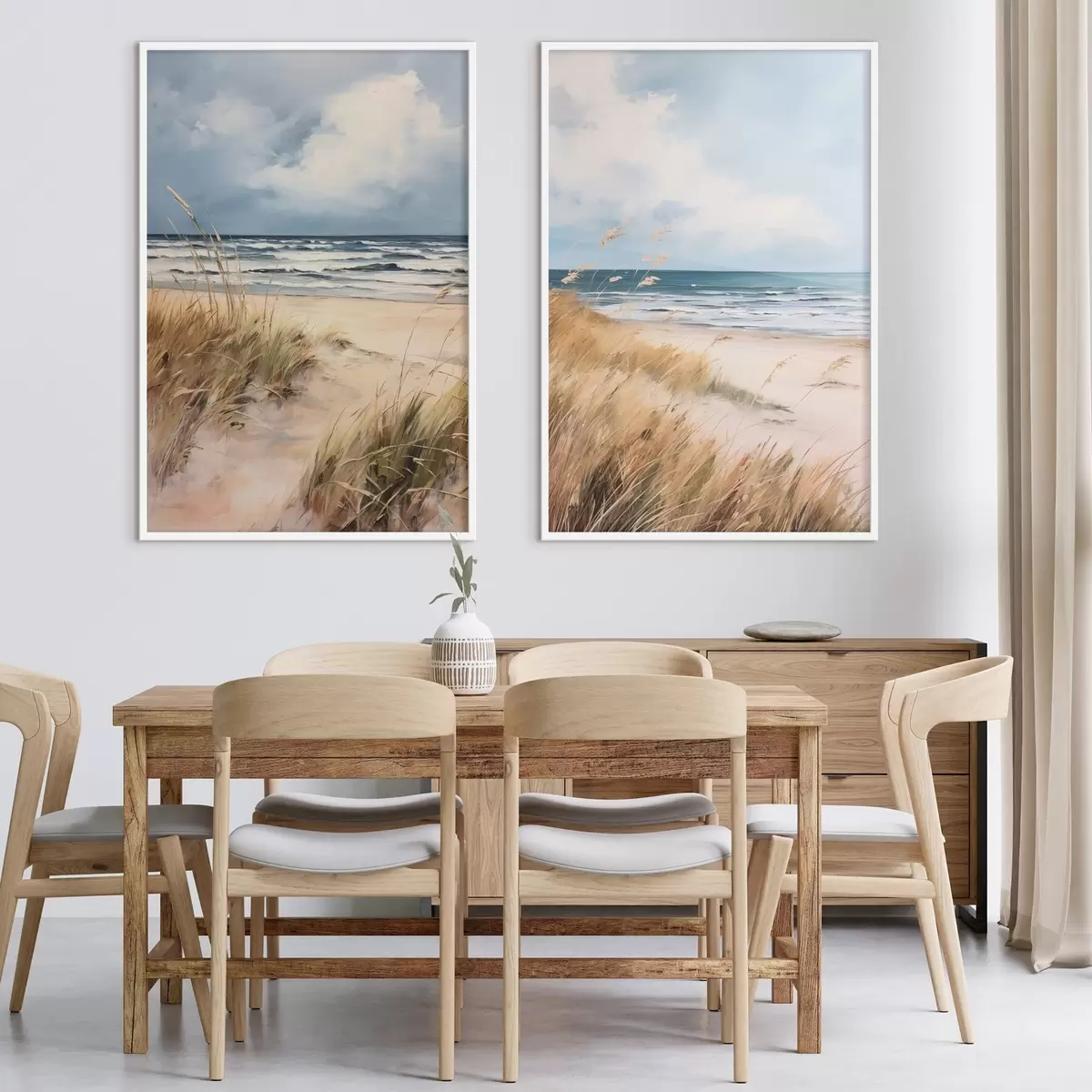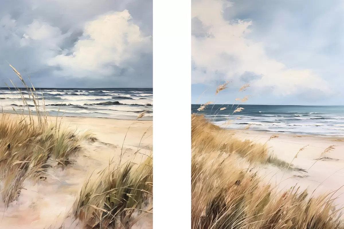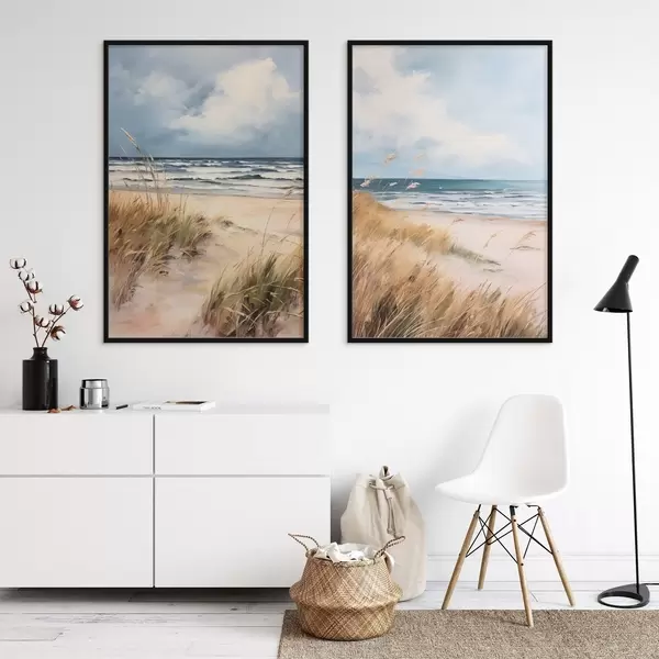 Poster Ein Sandstrand mit hohem Gras im Vordergrund, das Meer mit Wellen und ein bewölkter Himmel im Hintergrund Nr d00521