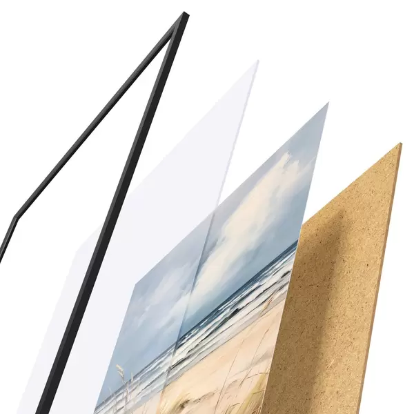 Das Poster besteht aus einem Rahmen, Plexiglas, einem gedruckten Bild und einer Rückwand aus Spanplatten. Dank der Halterungen auf der Rückseite kann das Poster sofort an die Wand gehängt werden.