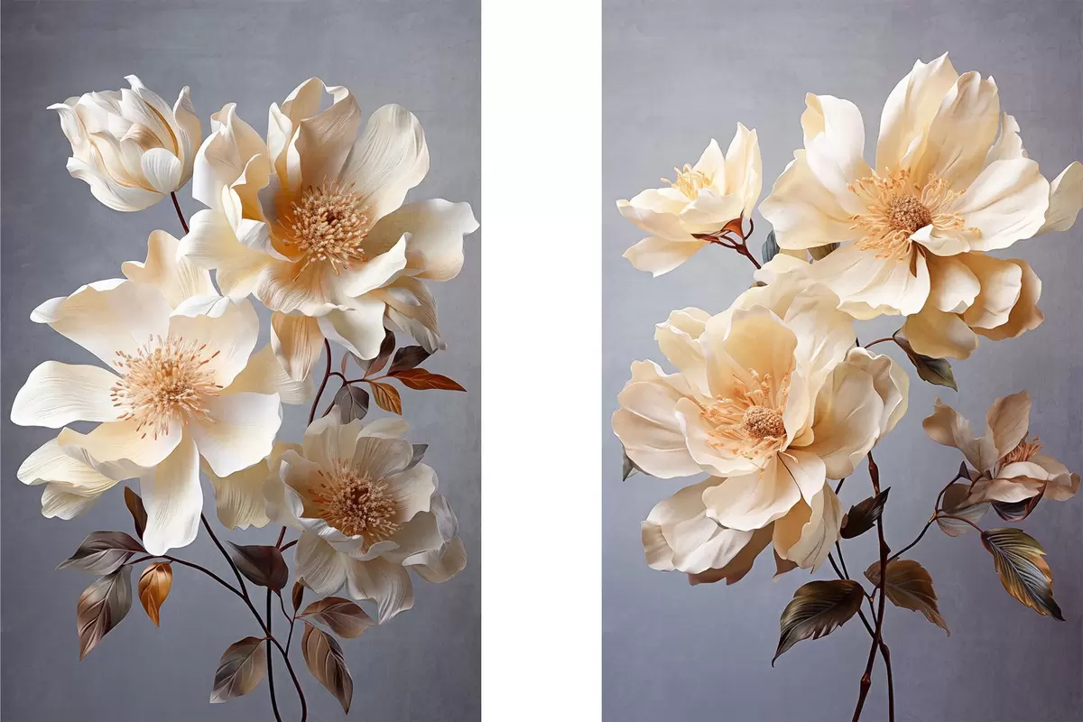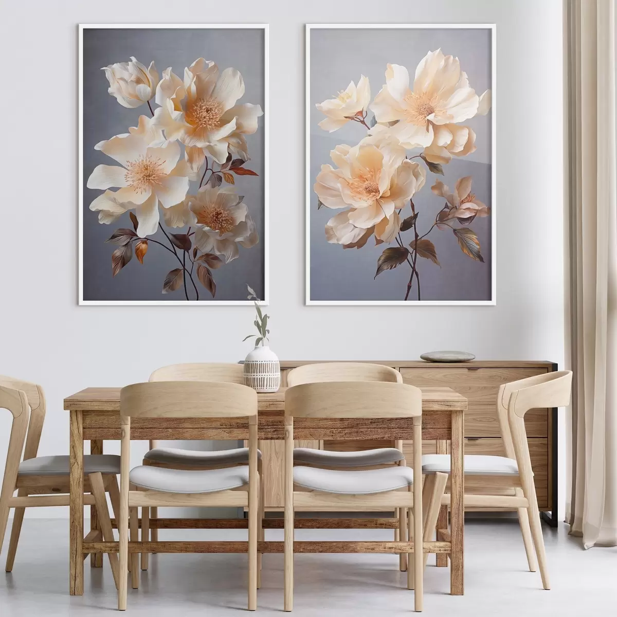Poster Texturierte Blumen mit orangefarbenen Blütenstempeln und orangefarbenen Blättern auf grauem Hintergrund, weiches Licht, elegant, detailliert, realistisch Nr d00525