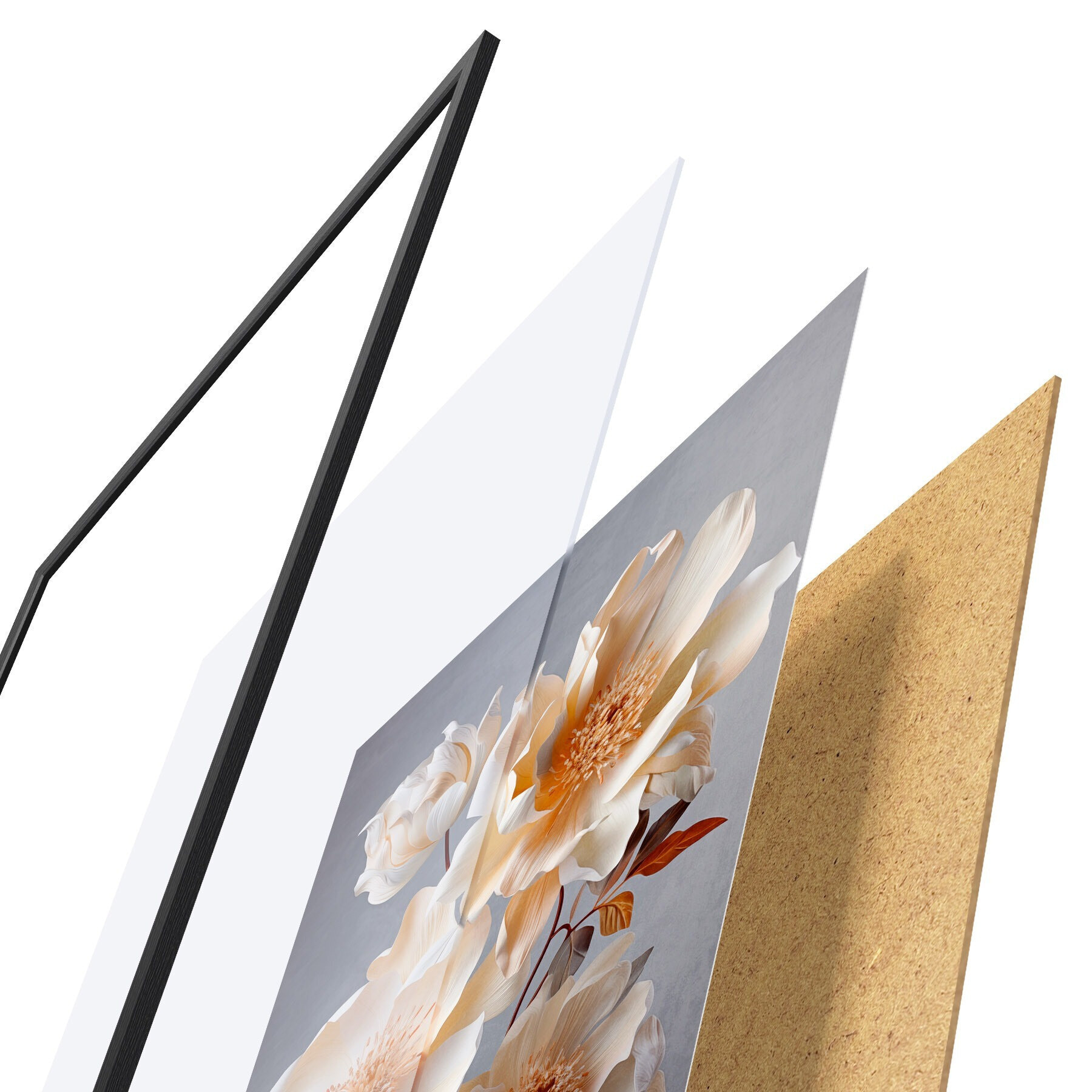 Das Poster besteht aus einem Rahmen, Plexiglas, einem gedruckten Bild und einer Rückwand aus Spanplatten. Dank der Halterungen auf der Rückseite kann das Poster sofort an die Wand gehängt werden.