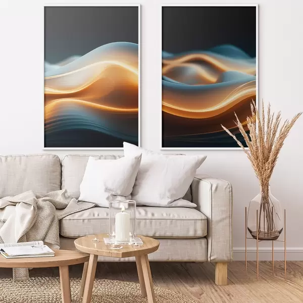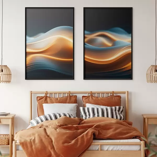 Poster Abstrakte fließende Formen mit orangefarbenen Linien, glatte Kurven und Linien, dynamische Komposition, dunkler Hintergrund Nr d00526