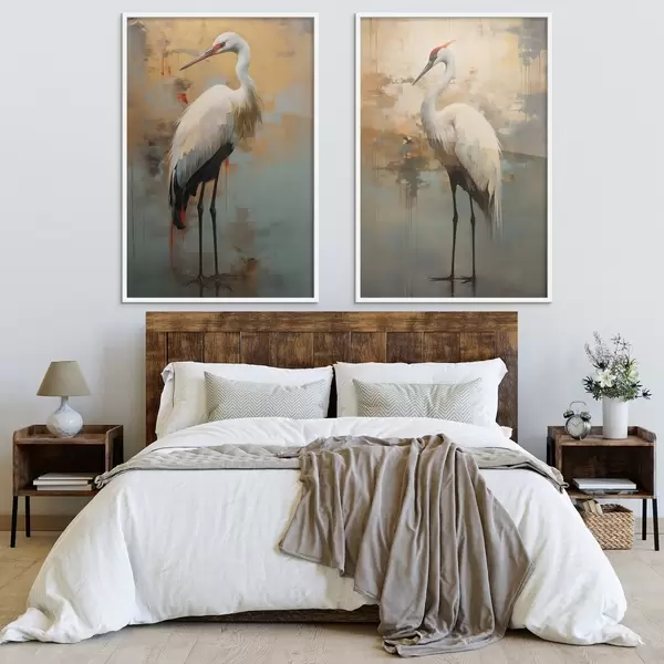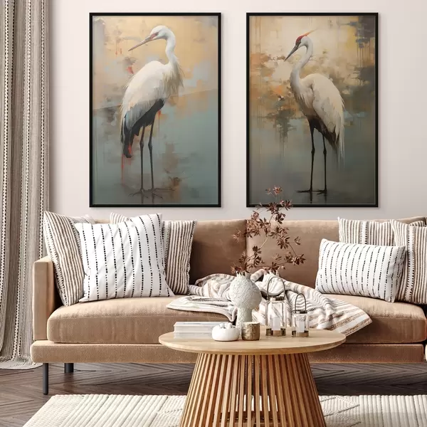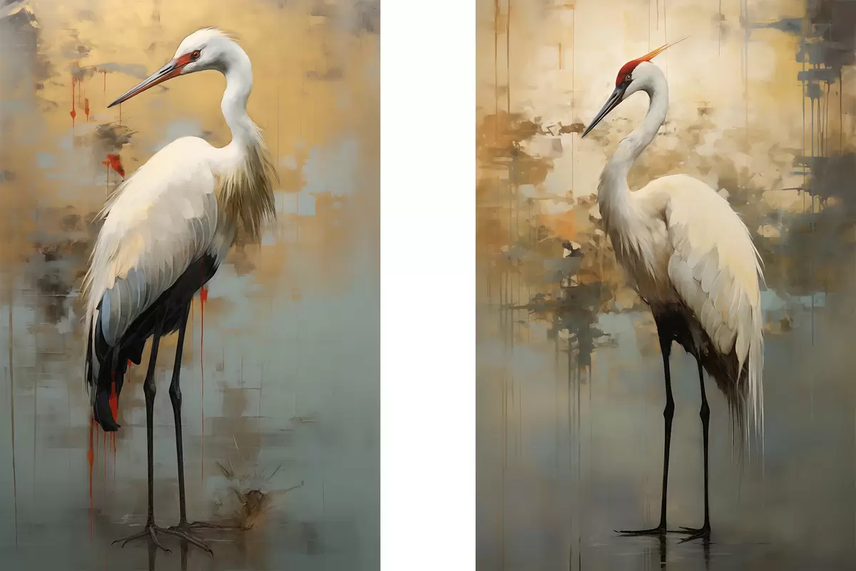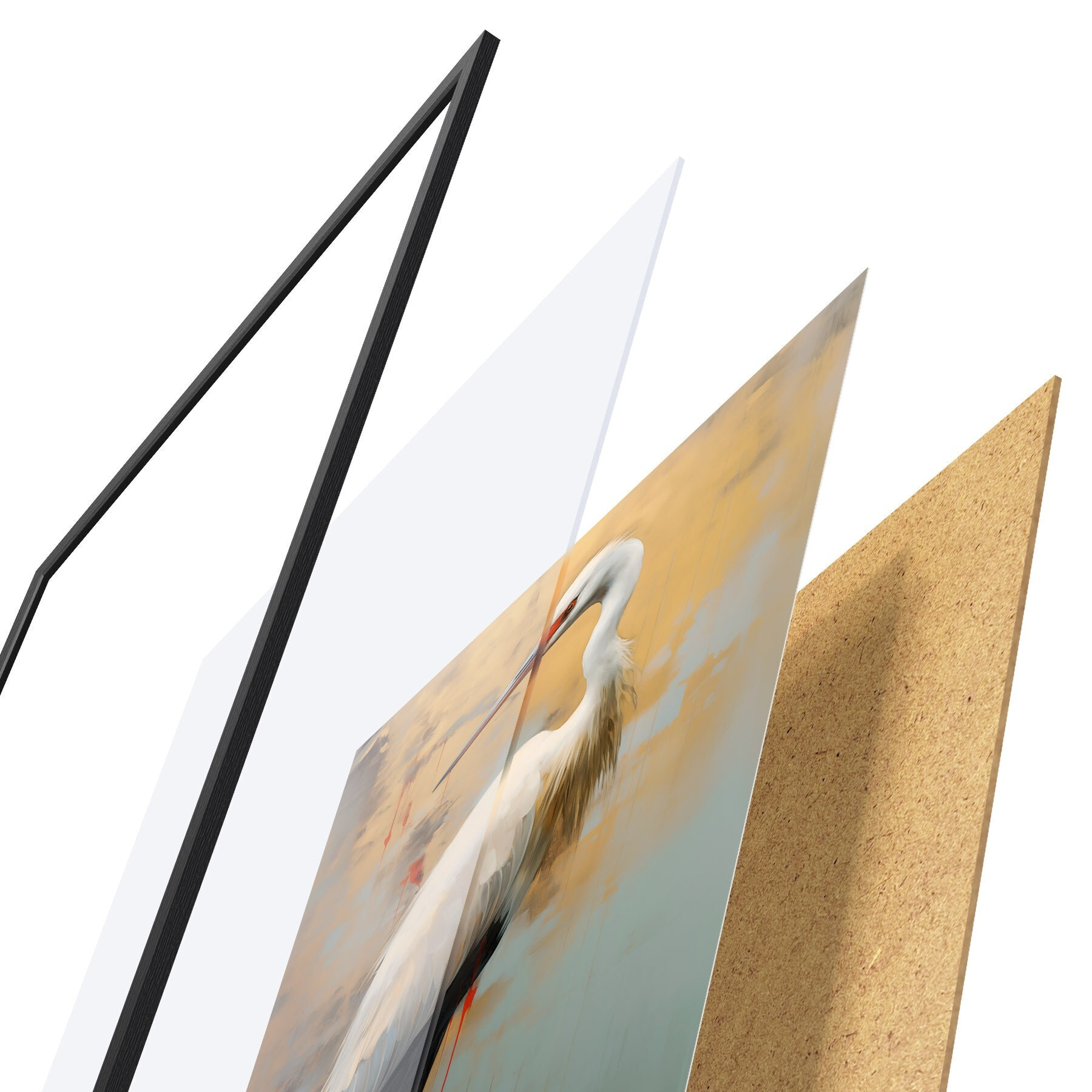 Poster Weißer Reiher vor einem Hintergrund aus gedämpften Gelb-, Braun- und Blautönen, der an eine neblige, abstrakte Landschaft erinnert Nr d00530