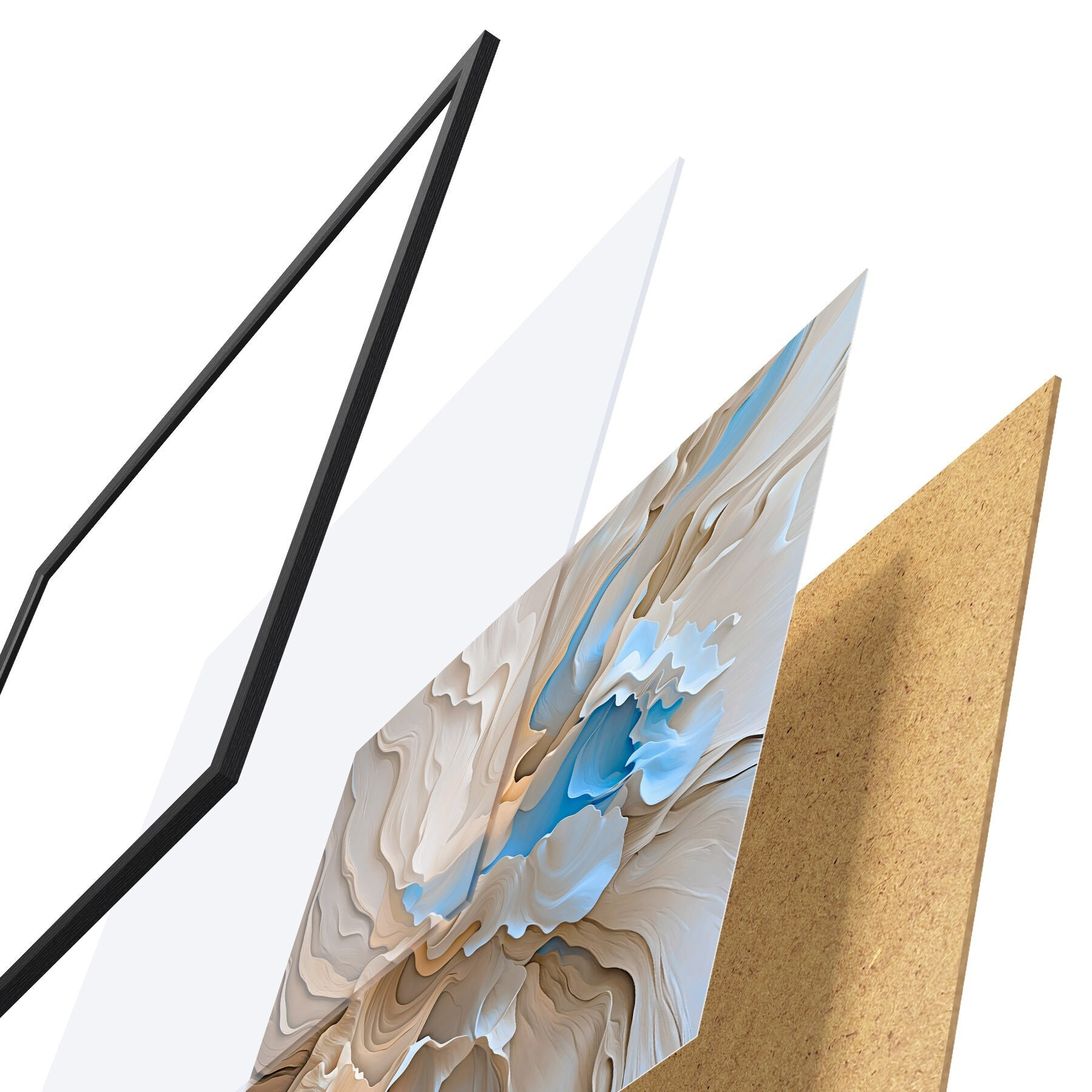 Das Poster besteht aus einem Rahmen, Plexiglas, einem gedruckten Bild und einer Rückwand aus Spanplatten. Dank der Halterungen auf der Rückseite kann das Poster sofort an die Wand gehängt werden.