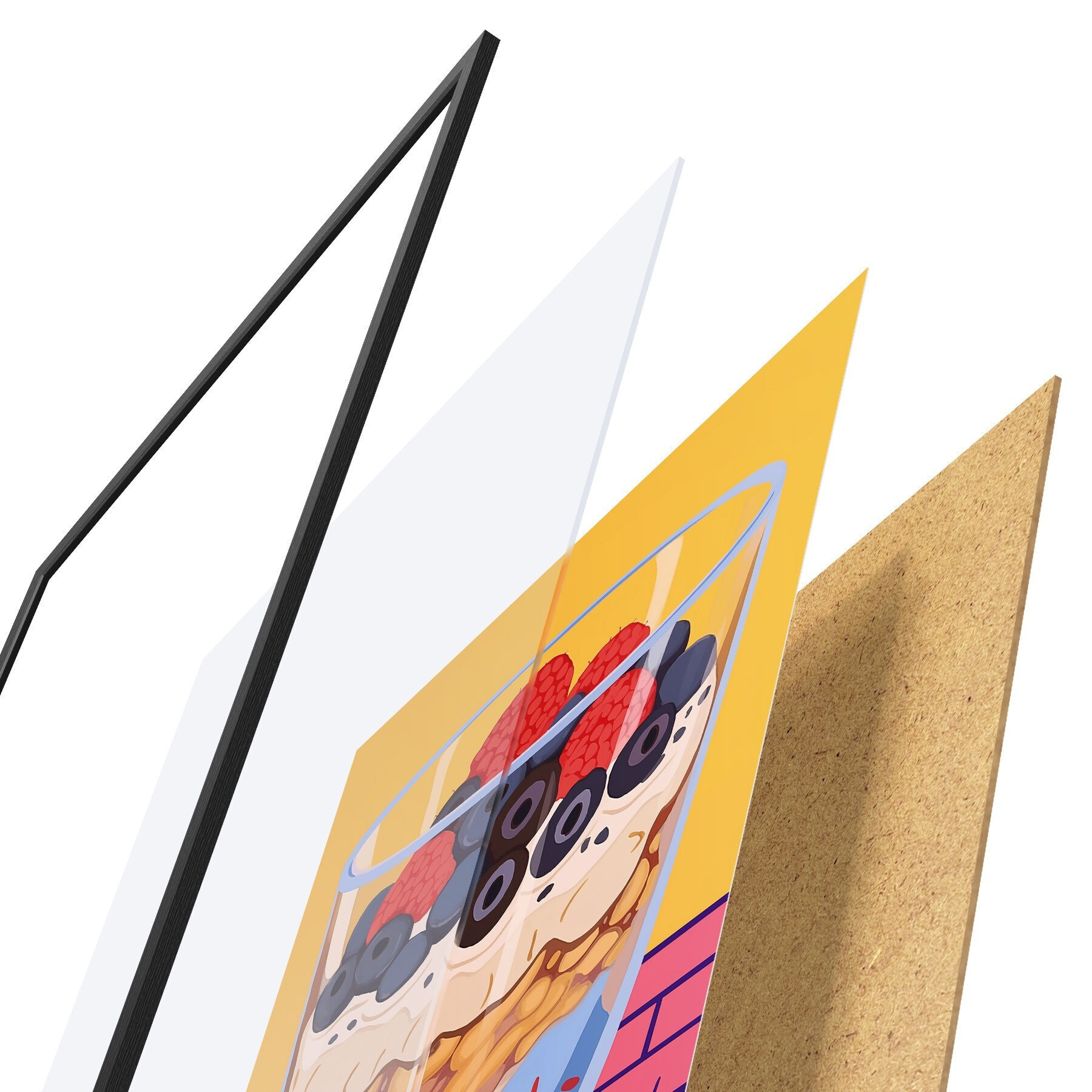 Das Poster besteht aus einem Rahmen, Plexiglas, einem gedruckten Bild und einer Rückwand aus Spanplatten. Dank der Halterungen auf der Rückseite kann das Poster sofort an die Wand gehängt werden.