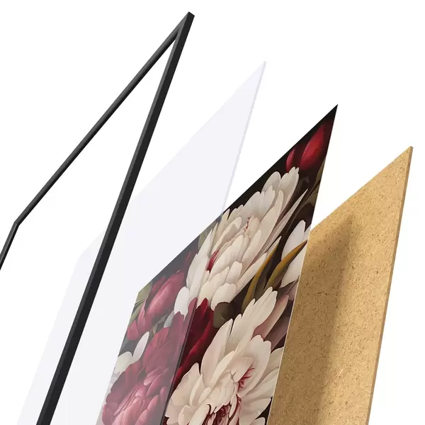 Das Poster besteht aus einem Rahmen, Plexiglas, einem gedruckten Bild und einer Rückwand aus Spanplatten. Dank der Halterungen auf der Rückseite kann das Poster sofort an die Wand gehängt werden.