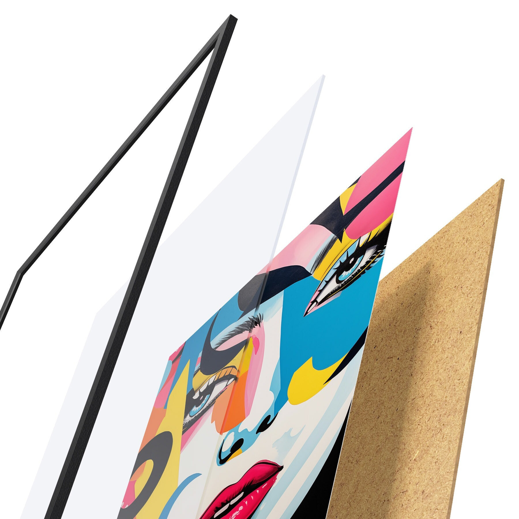 Das Poster besteht aus einem Rahmen, Plexiglas, einem gedruckten Bild und einer Rückwand aus Spanplatten. Dank der Halterungen auf der Rückseite kann das Poster sofort an die Wand gehängt werden.