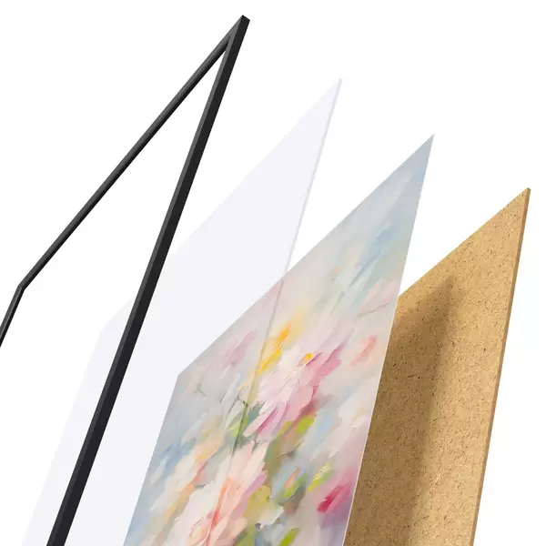 Das Poster besteht aus einem Rahmen, Plexiglas, einem gedruckten Bild und einer Rückwand aus Spanplatten. Dank der Halterungen auf der Rückseite kann das Poster sofort an die Wand gehängt werden.