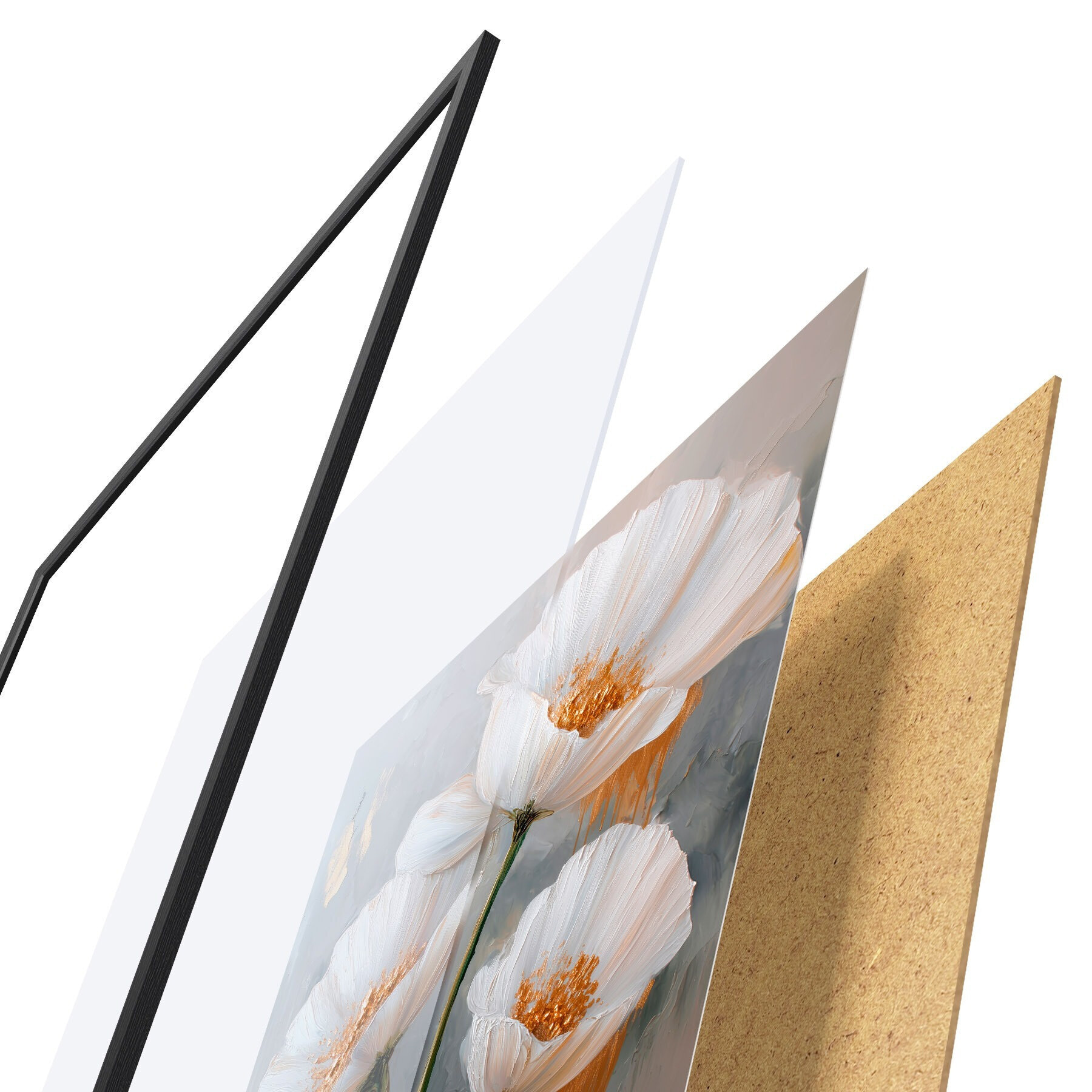 Das Poster besteht aus einem Rahmen, Plexiglas, einem gedruckten Bild und einer Rückwand aus Spanplatten. Dank der Halterungen auf der Rückseite kann das Poster sofort an die Wand gehängt werden.