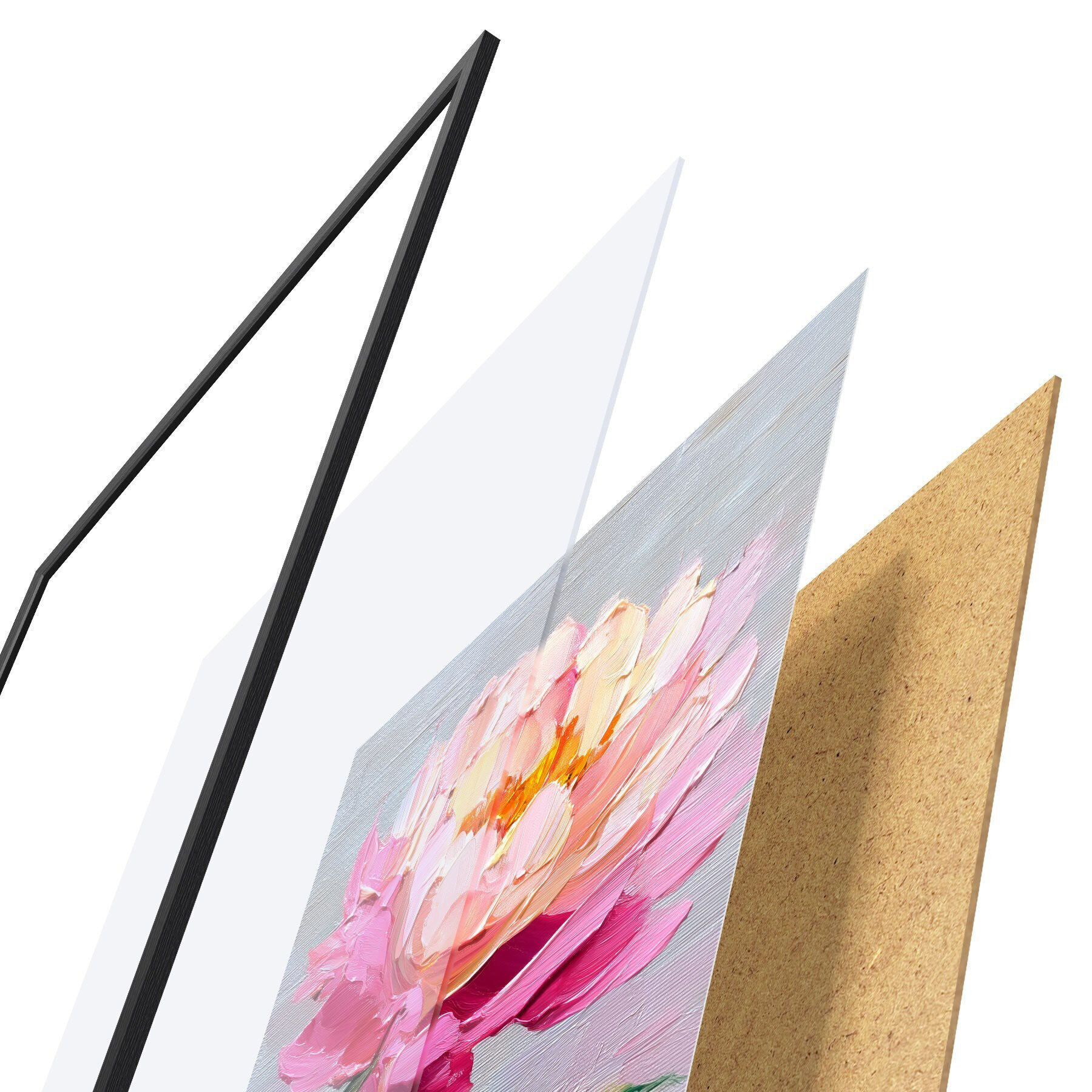 Das Poster besteht aus einem Rahmen, Plexiglas, einem gedruckten Bild und einer Rückwand aus Spanplatten. Dank der Halterungen auf der Rückseite kann das Poster sofort an die Wand gehängt werden.
