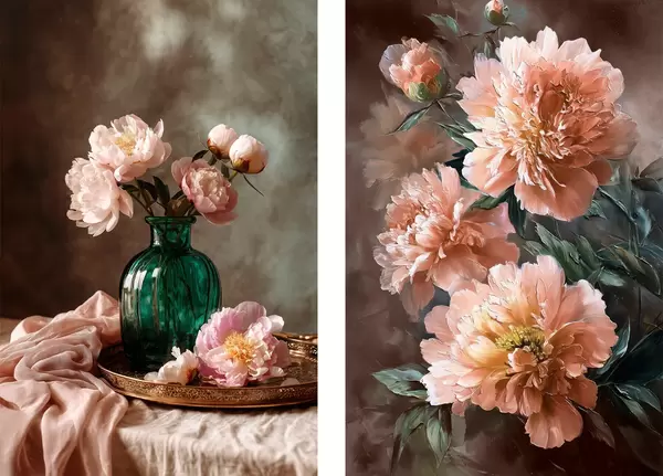 Poster Gepaart Zusammensetzung mit rosa Pfingstrosen in einer Vase und auf Leinwand Nr d00578
