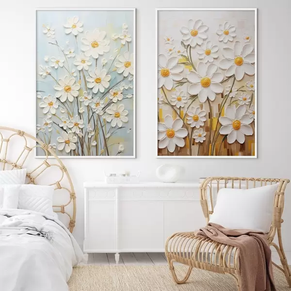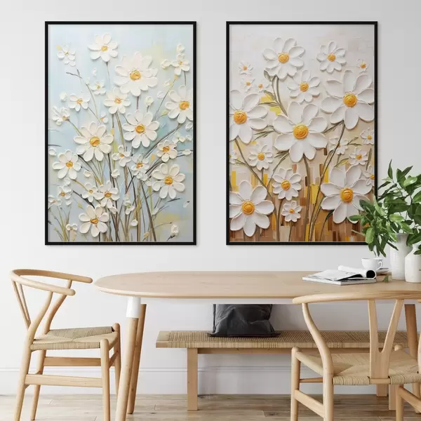 Poster Sonnige Blumen: Kunstduett mit volumetrischen Gänseblümchen und gelben Akzenten d00580