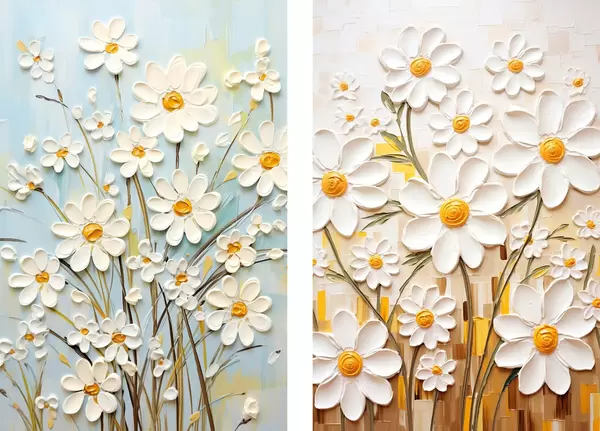 Poster Sonnige Blumen: Kunstduett mit volumetrischen Gänseblümchen und gelben Akzenten d00580