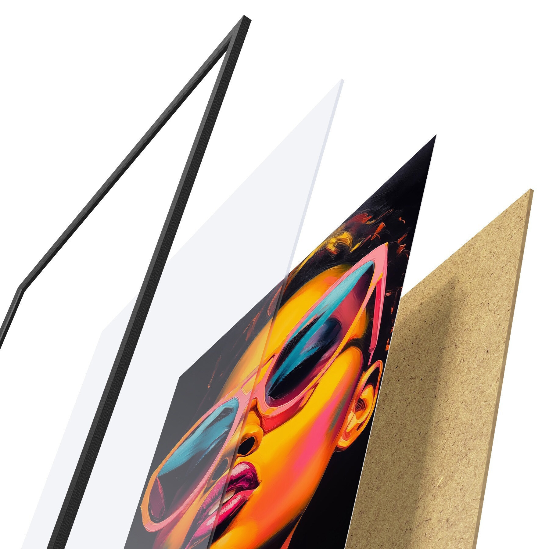 Das Poster besteht aus einem Rahmen, Plexiglas, einem gedruckten Bild und einer Rückwand aus Spanplatten. Dank der Halterungen auf der Rückseite kann das Poster sofort an die Wand gehängt werden.